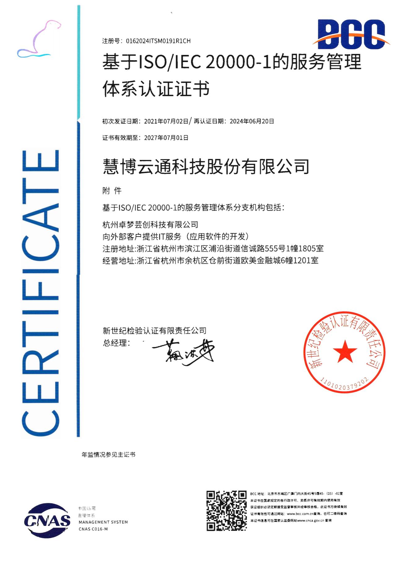 服务管理体系认证证书