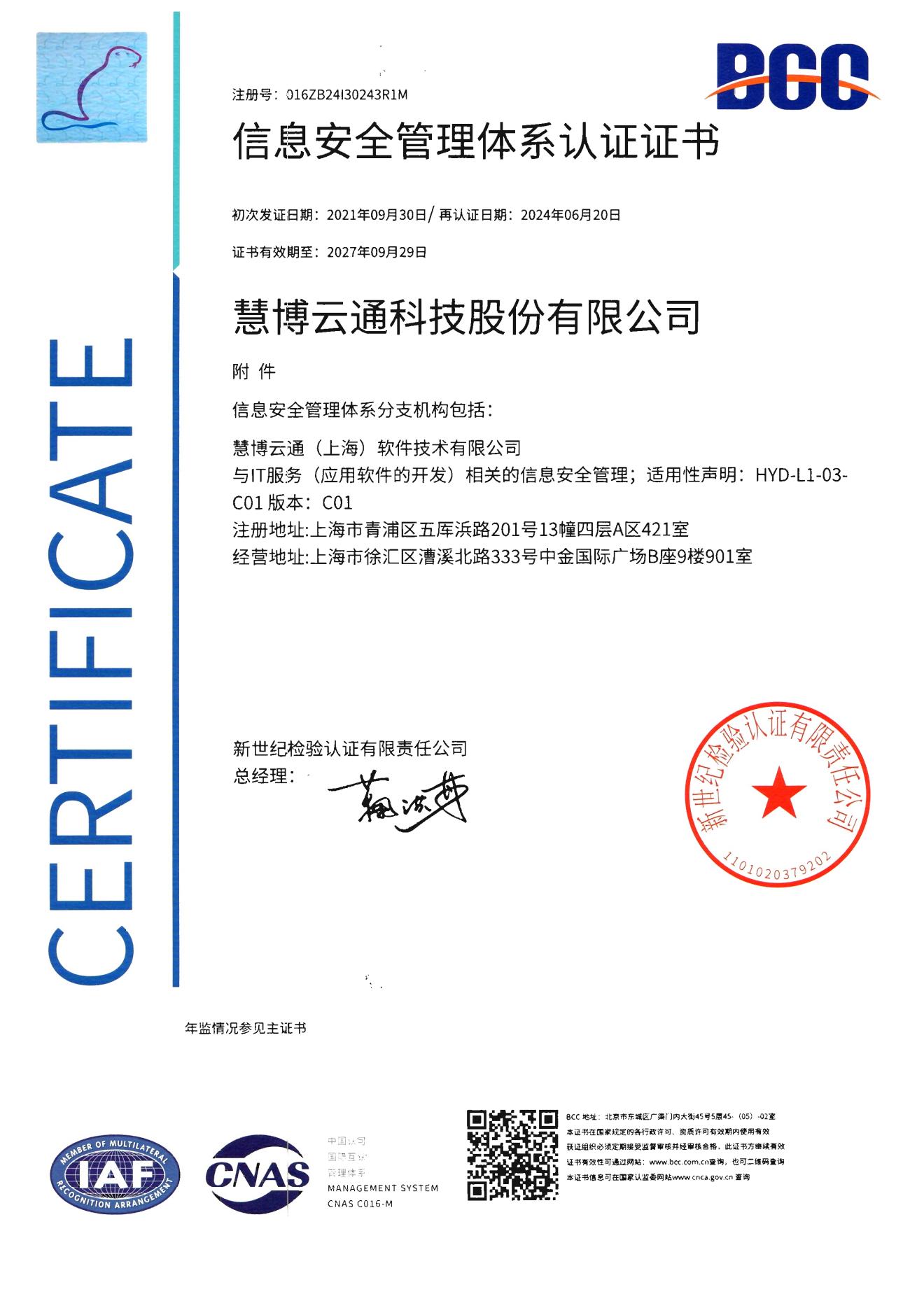 信息安全管理体系认证证书