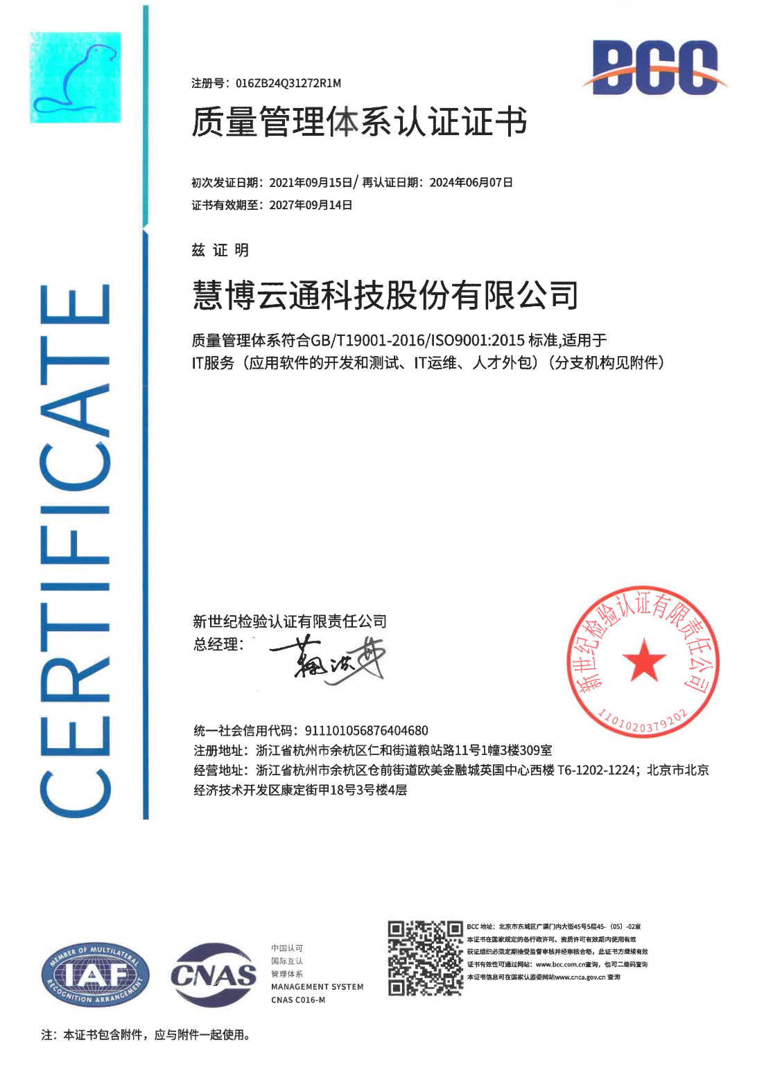质量管理体系认证证书