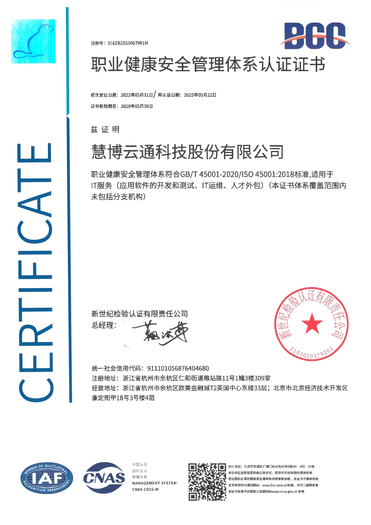 职业健康安全管理体系认证证书