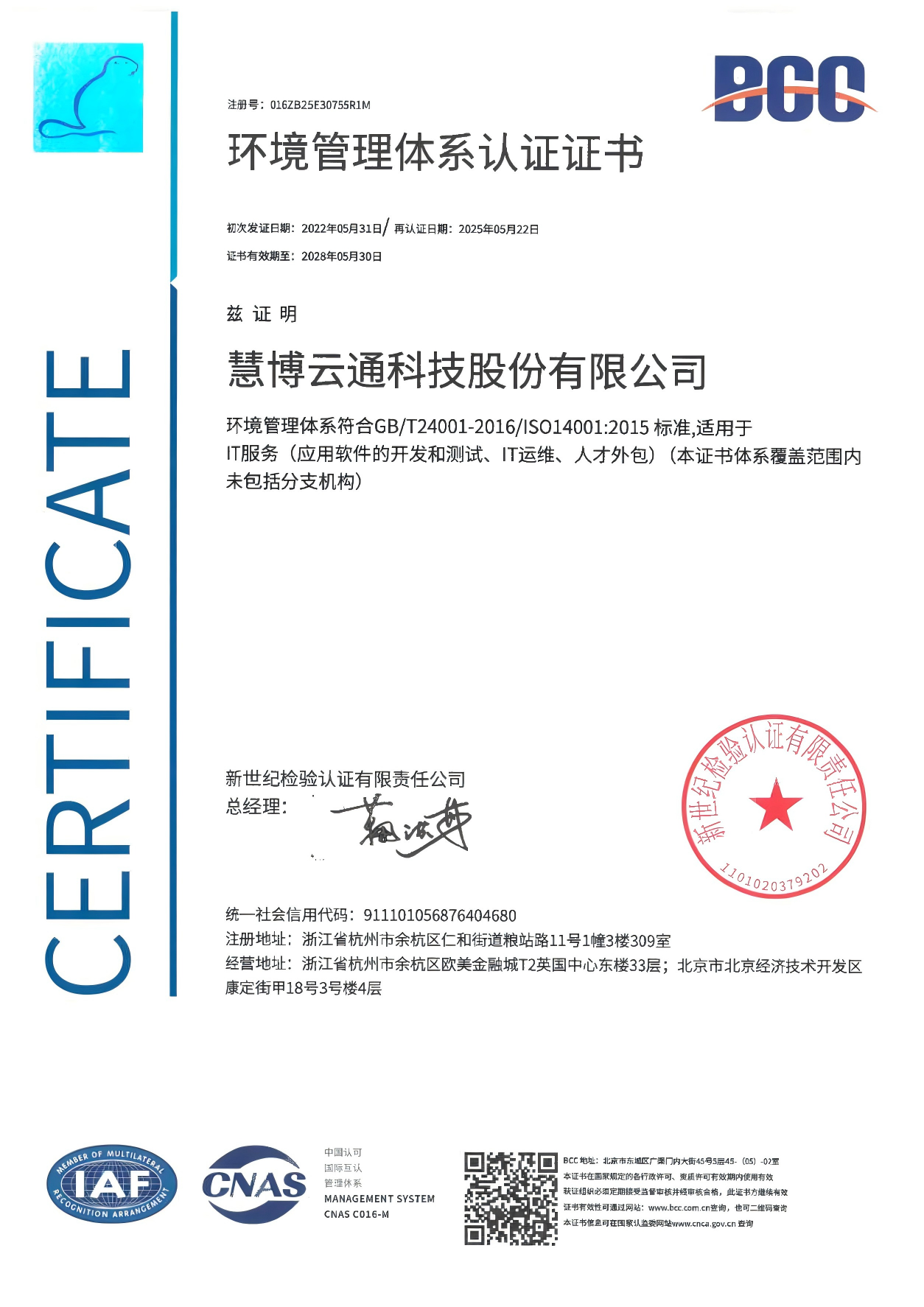 环境管理体系认证证书